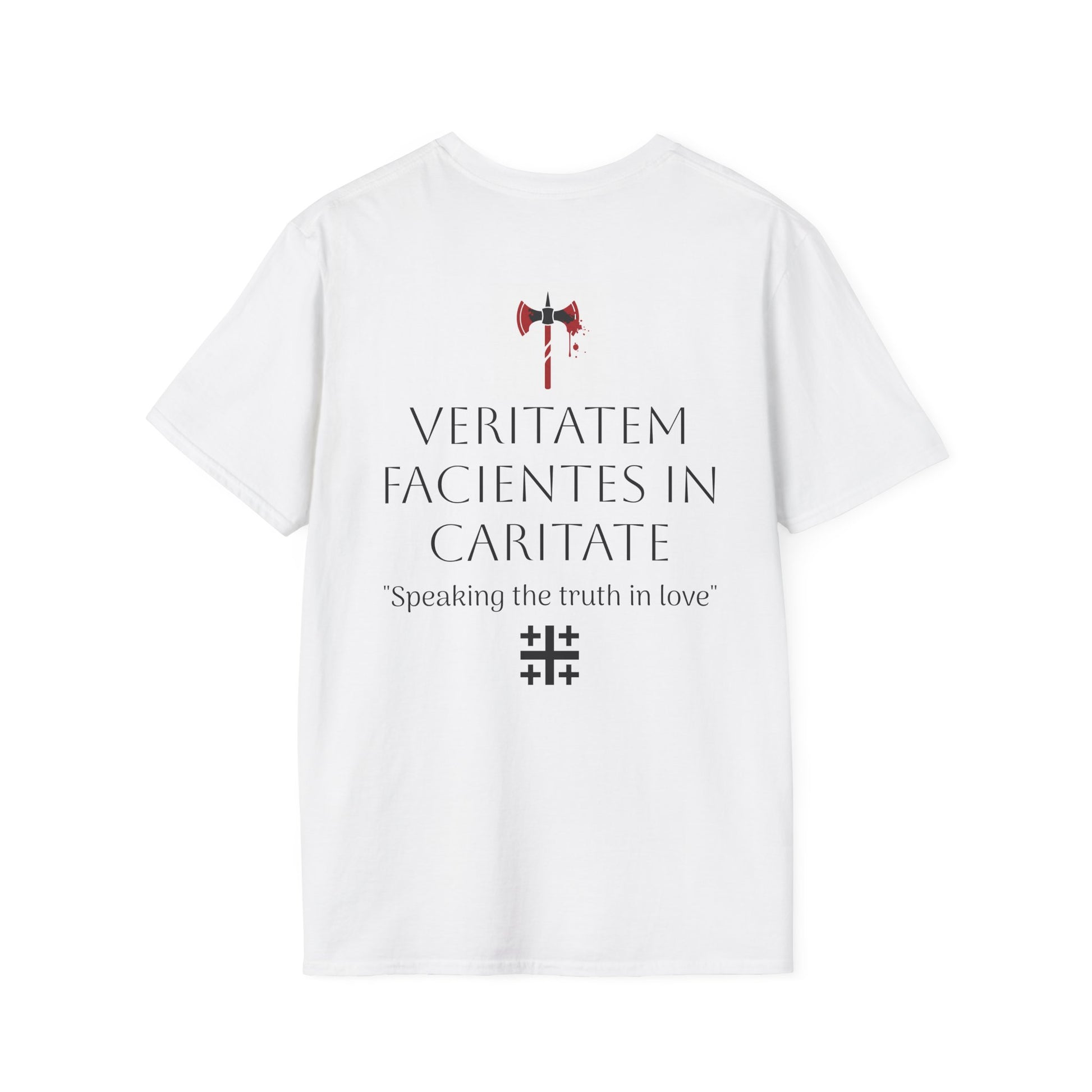 A lightweight, thoughtfully made tee that speaks quietly but confidently. It reads VERITAS across the chest beside a small, blood-tipped double-headed axe — a reference to St. Peter of Verona's Martyrdom for preaching the Truth and how that Truth would later convert his assassin. The back expands the message with the quote from Ephesians 4:15, "Veritatem facientes in caritate," and the English subtitle, "Speaking the truth in love,".